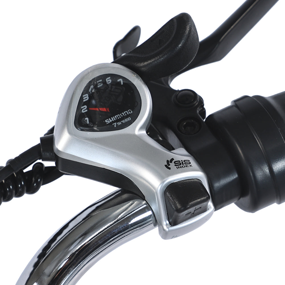 Equipped with an imported Shimano 7-speed shifting system and a customized aluminum alloy crank 52T gear wheel. The classic collocation with rear 7 levels, sis positioning, and durable 7-speed greatly improve the fun of riding.