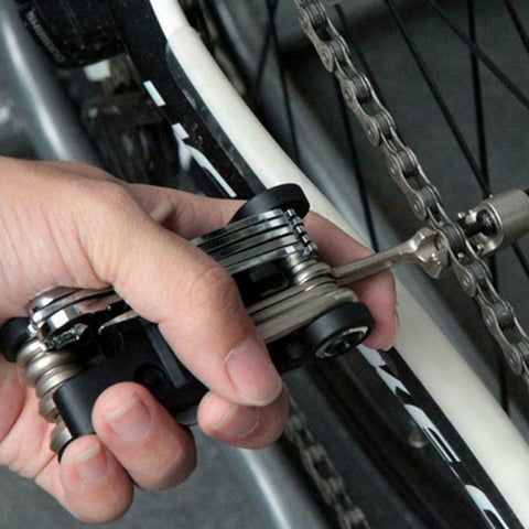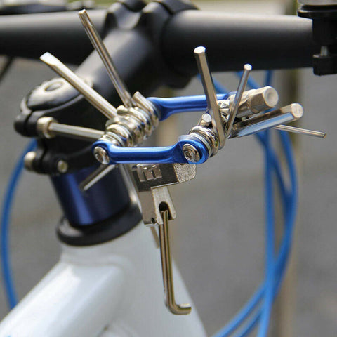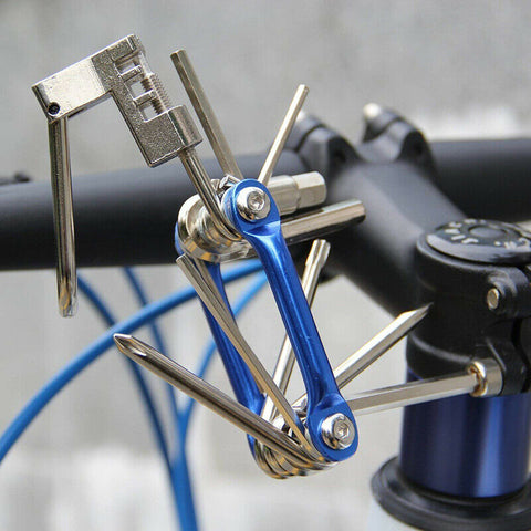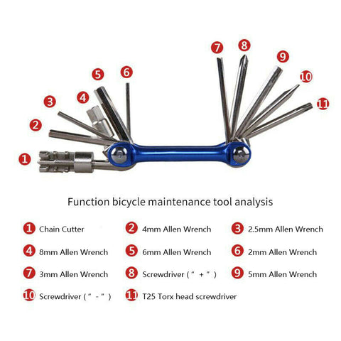 11Precision Bike Tools Including: Hex Wrench (Allen Key) 2 / 2.5 / 3 / 4 / 5 / 6 / 8 mm, Screwdriver, Slotted Screwdriver, T25 Torx and 1 Chain Cutting Tool. This multi repair tools kit can help you solve most bike problems.