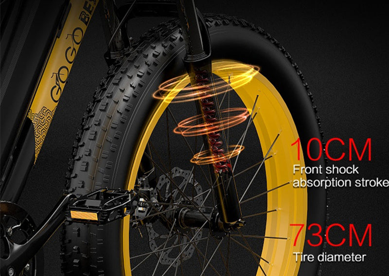 The 26*4.0 inches wheels are comfortable, stable, and suitable for all roads. It has anti-skid and anti-vibration functions, ensuring a longer span, bigger, faster, and less effort ride.