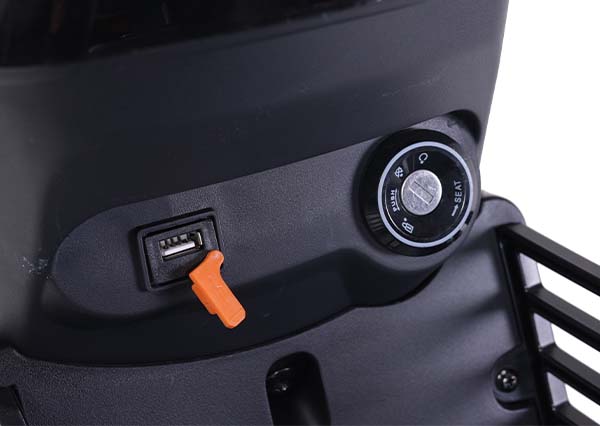 The handlebars feature a USB port for convenient phone charging, and the port is covered with a waterproof latex cap for added more safety and practicality.